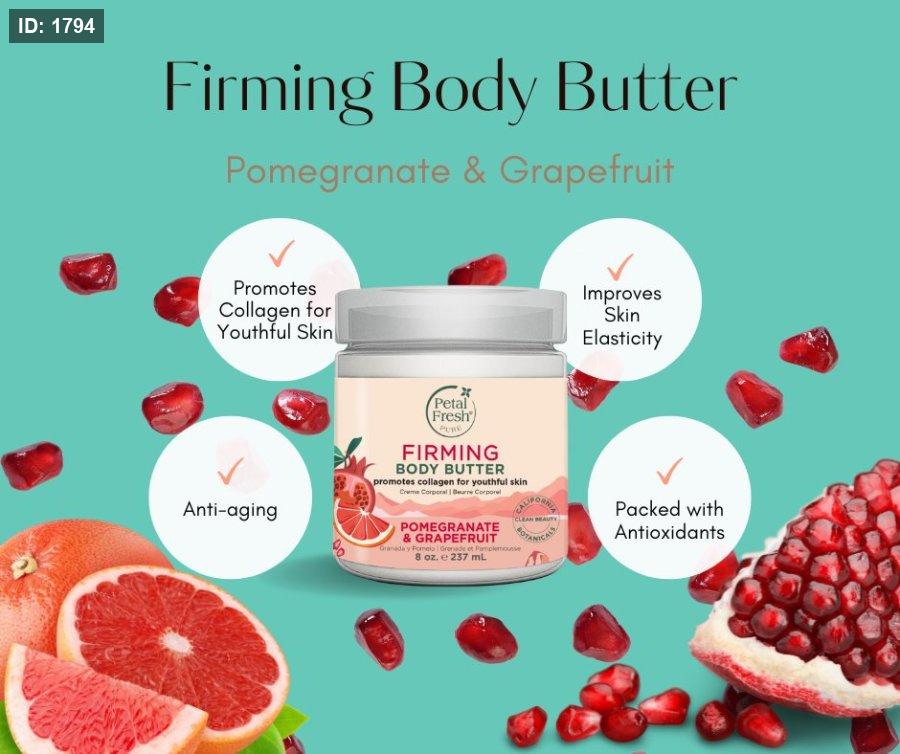 يرطب البشرة ويشدها باستخدام زبدة الجسم النقية من Petal Fresh® مع الرمان والجريب فروت. يعمل الرمان والجريب فروت العضويان المعتمدان على تعزيز تخليق الكولاجين بشكل فعال للحصول على بشرة مشدودة. هذه التركيبة الغنية والكريمية معززة بمركب زيت جوز الهند - وهو مزيج غريب من زيت جوز الهند وزيت الأركان ومستخلص زبدة الشيا ليترك بشرتك ناعمة الملمس كالحرير.