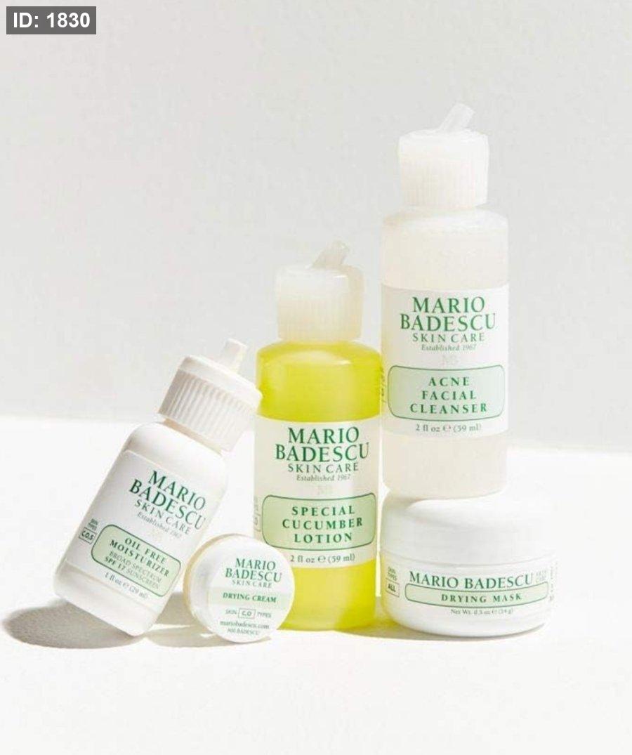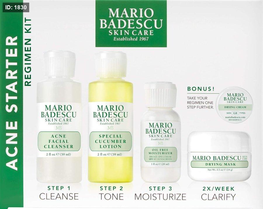مجموعة Mario Badescu Acne Starter Regimen Kit هي نظام يجب اقتناؤه مصمم لمنح البشرة المضطربة بداية واضحة. يتضمن منظف الوجه لحب الشباب، وغسول الخيار الخاص، والمرطب الخالي من الزيوت بعامل حماية من الشمس SPF 17، وقناع التجفيف الخاص بنا، وعينة من كريم التجفيف
