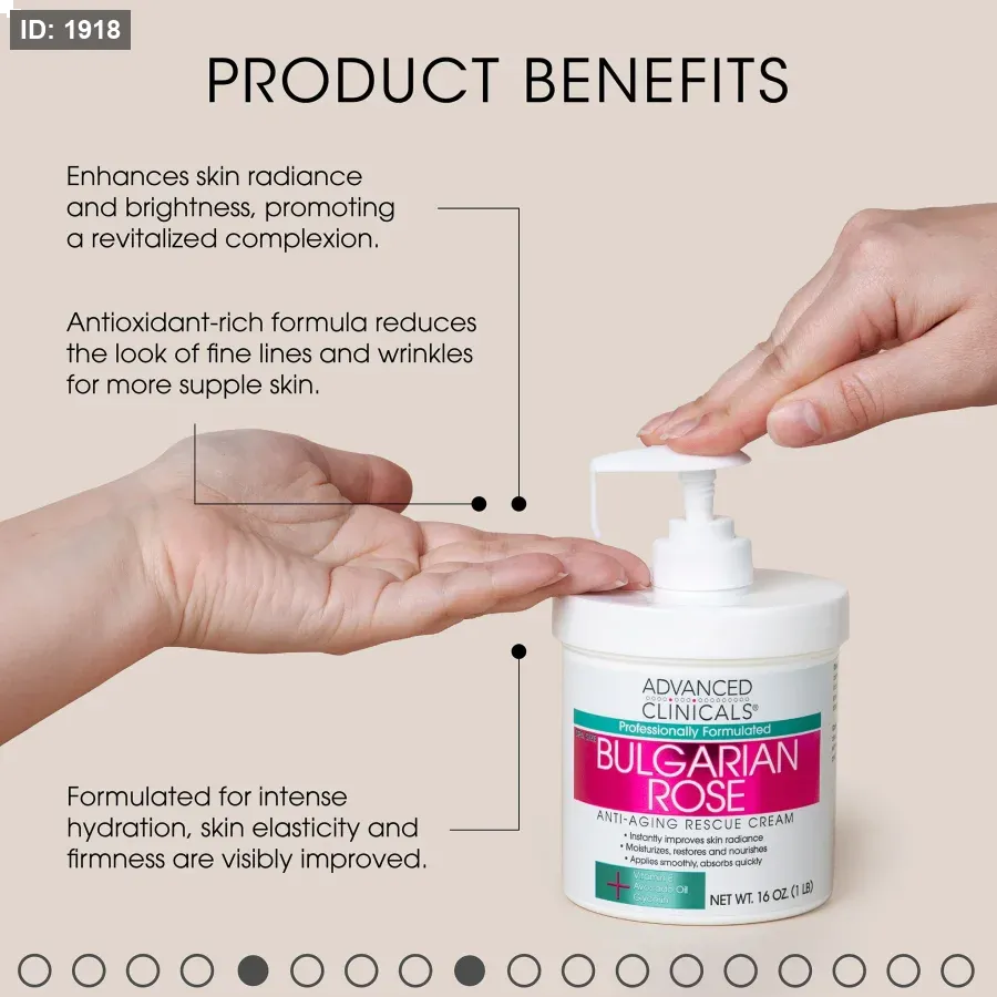 تم تصميم كريم الإنقاذ المضاد للشيخوخة من الورد البلغاري من Advanced Clinicals لترطيب وتغذية واستعادة البشرة الجافة. كريم الترطيب المركز هذا غني بالورد البلغاري الطبيعي لتعزيز مظهر مرن ومرتفع. يجدد رطوبة البشرة الجافة بفيتامين E وزيت الأفوكادو.