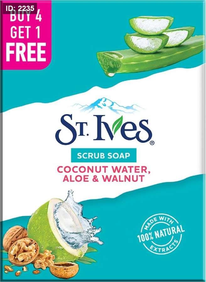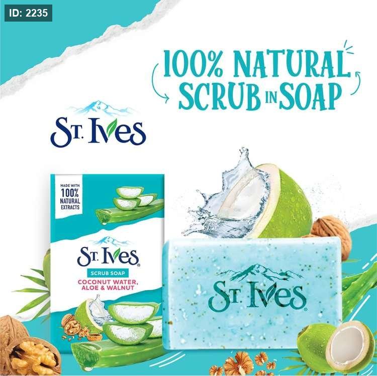 St. Ives’ Scrub Bar Soap with Coconut Water, Aloe, and Walnut صابون مقشر للجسم يحتوي على مزيج من ماء جوز الهند والألوة والجوز. يتميز هذا الصابون بتركيبته التي تساعد على تنظيف البشرة بلطف مع تقشير خفيف، مما يترك البشرة ناعمة ومشرقة.