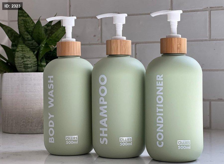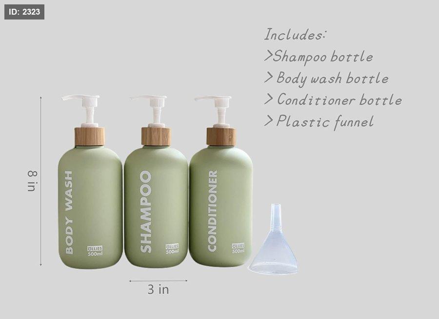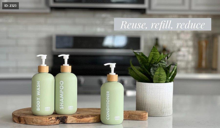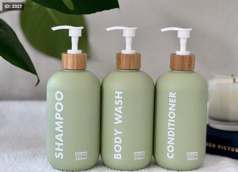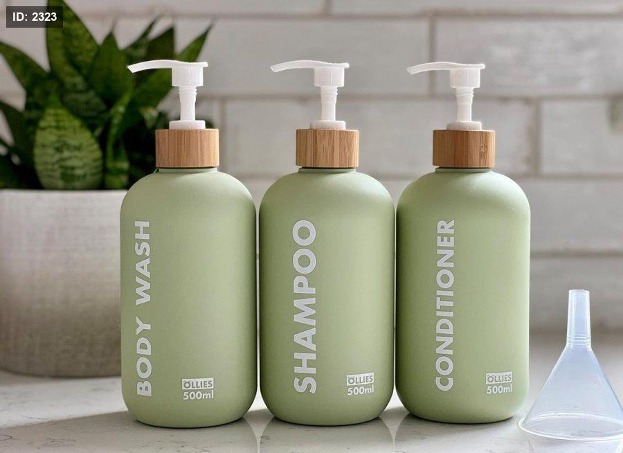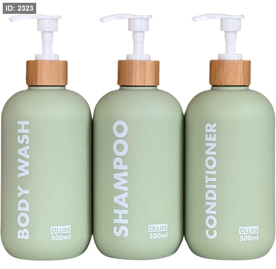 مجموعة من 3 علب شامبو وبلسم وصابون بحجم 500 مل لكل علبة ، تأتي بلون أخضر أنيق مع ملصقات دائمة.