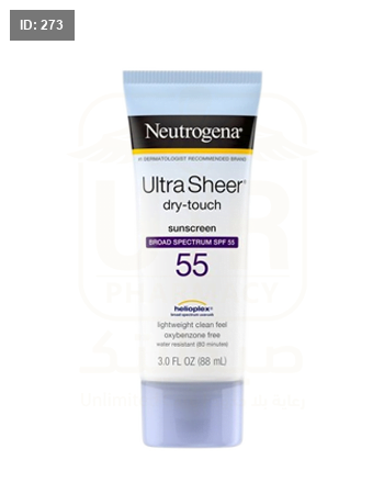 لوشن واقي من الشمس بدرجة 55 الترا شير دراي تاتش من نيوتروجينا، حماية من الاشعة فوق البنفسجية فئة A وB، خالٍ من الاوكسي بنزون، خفيف، مقاوم للماء، لا يسد المسام او الدهون