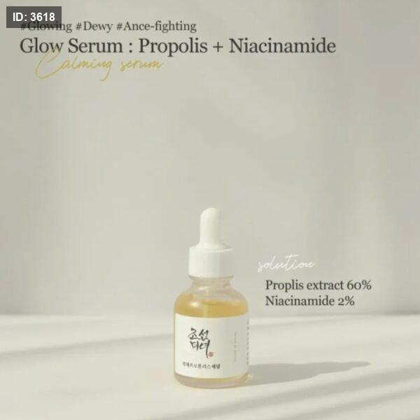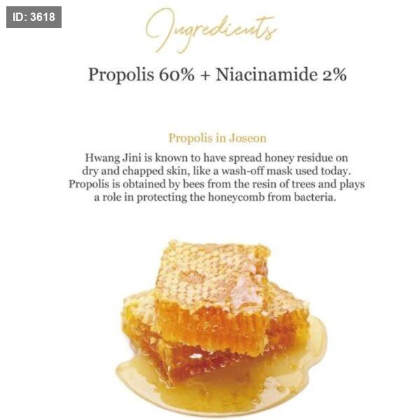 Propolis (خلاصة البروبوليس): مكوّن طبيعي من خلايا النحل، يُعرف بخصائصه المهدئة والمضادة للبكتيريا، ويساعد على تجديد البشرة وشفاء الحبوب.