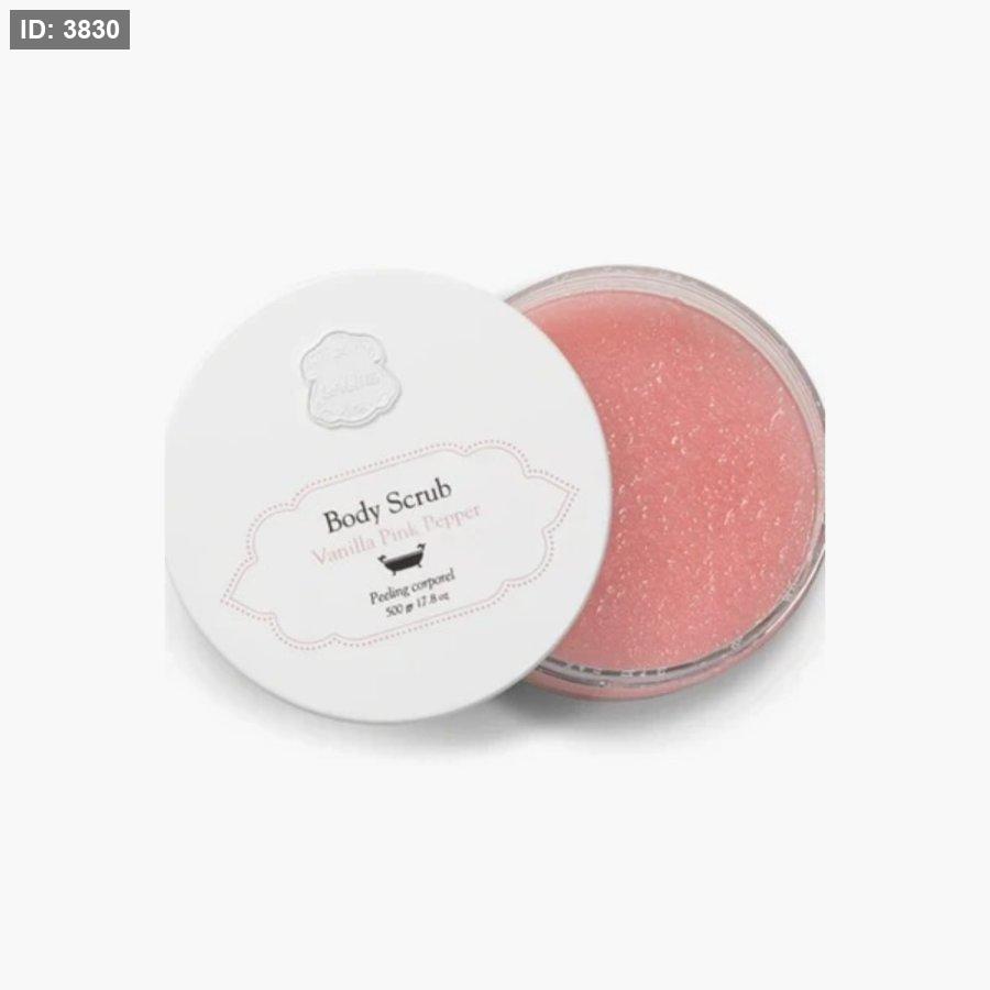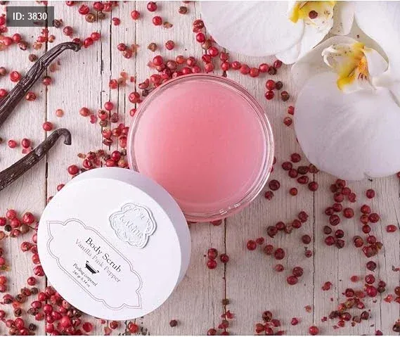 دلل حواسك مع Laline Vanilla Pink Pepper Body Scrub - علاج تقشير فاخر يجمع بين حلاوة الفانيليا والتوابل الرقيقة للفلفل الوردي. غني بالمعادن الطبيعية والزيوت المغذية، يقشر بلطف خلايا الجلد الميتة، ويترك جسمك ناعمًا ومشرقًا وذو رائحة عطرة.